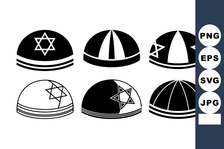 Set of six black and white Jewish kippah designs featuring star of david symbols and striped patterns in vector style. Religious headwear for cultural occasions with simple elegant mood.