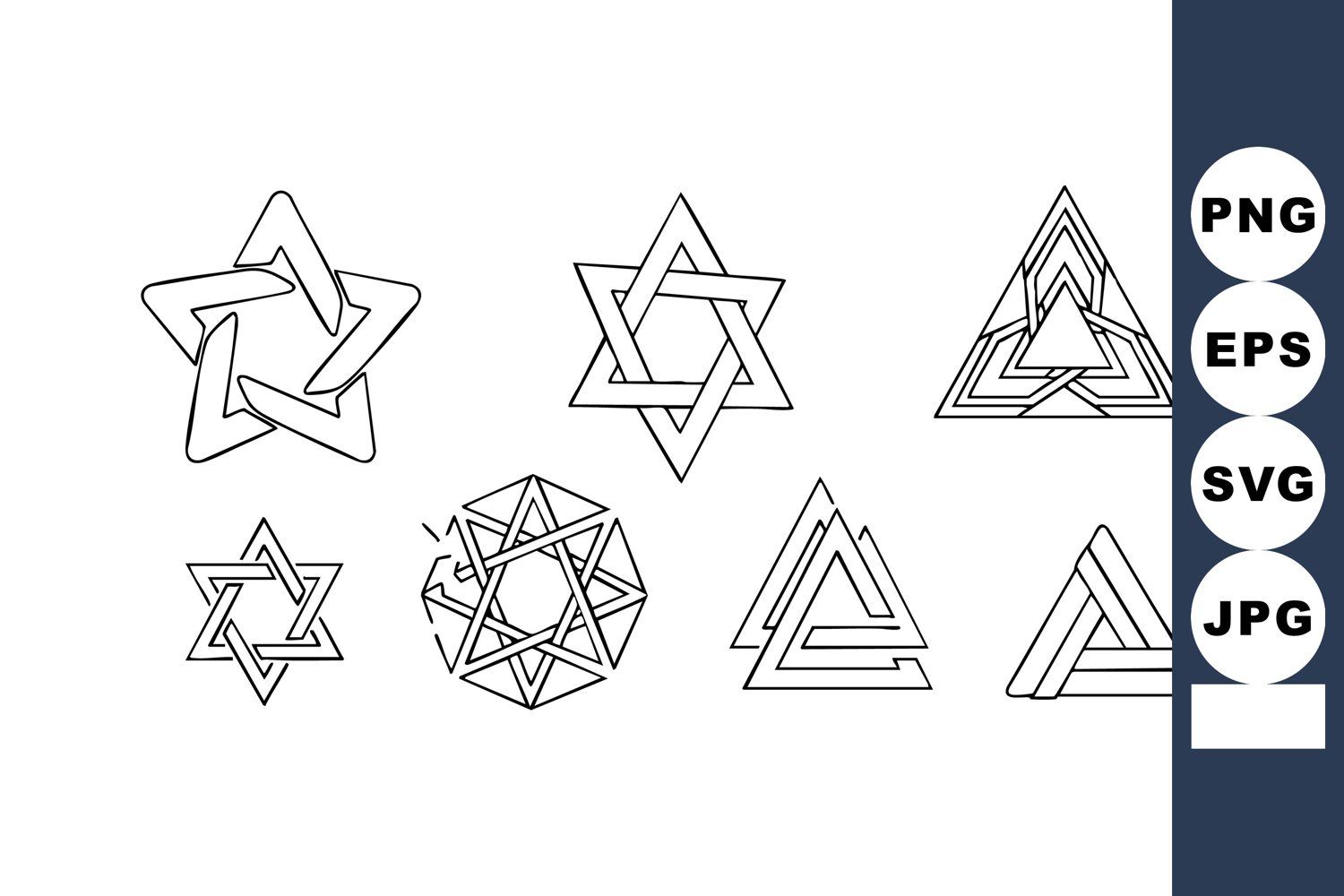 The image shows a set of seven geometric star and triangle shapes with interwoven lines in black and white vector style. The design appears abstract and modern. Calm mood.