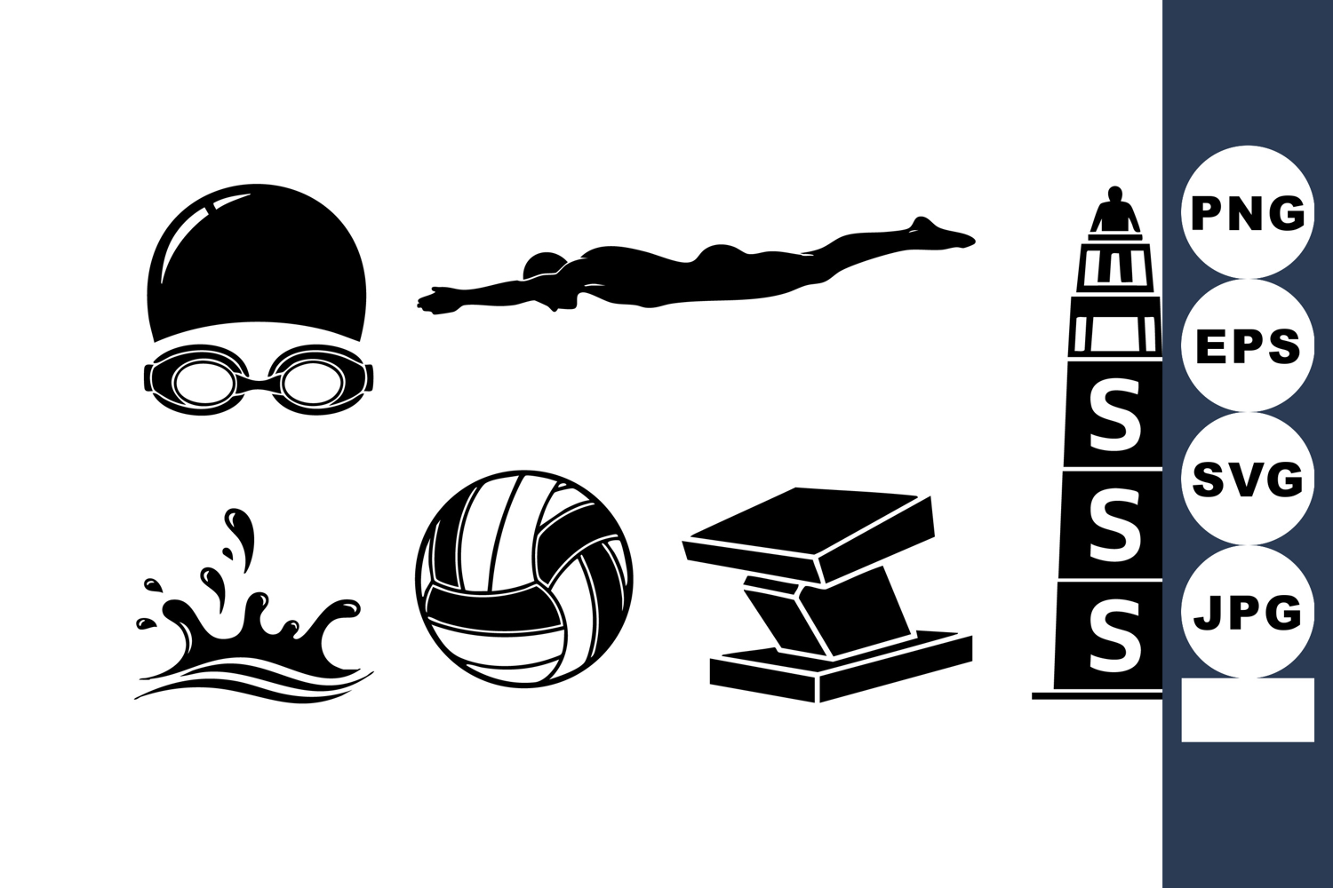 Black Silhouette Vector Swimming Cap Goggles Diving Swimmer Splash Water Volleyball Anvil Tower Sport Design Clean Design Shapes Swimming Sport Icons Goggles Diving Swimmer Water Splash Volleyball Anvil Tower Sport