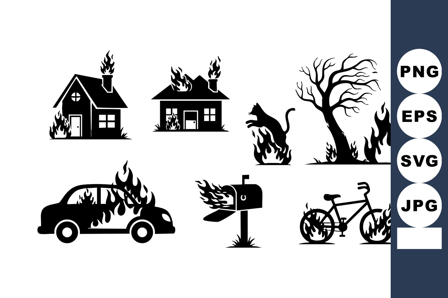 Burning House Car Bicycle Tree Cat Silhouette Vector