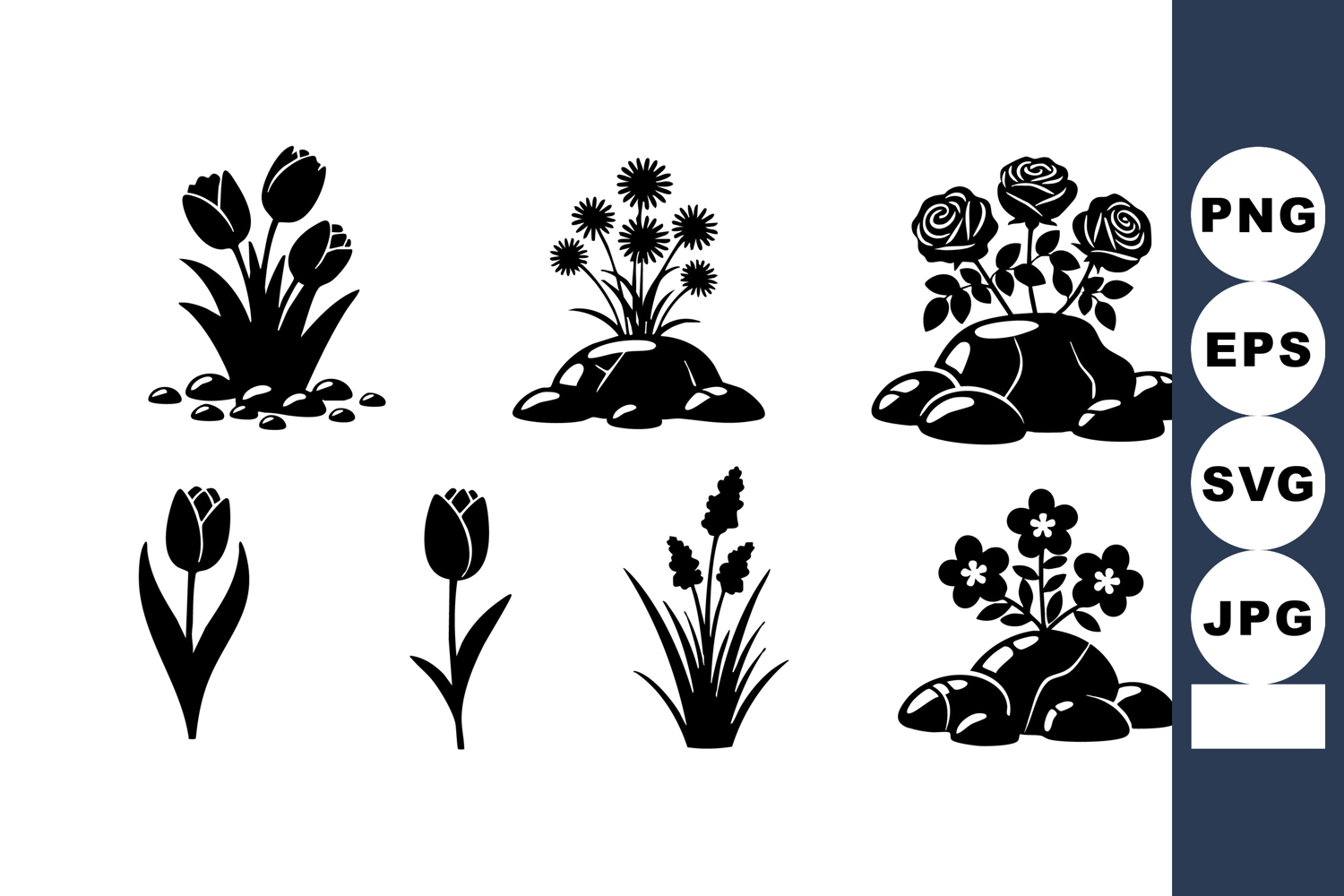 This vector illustration shows black silhouette flowers including tulips roses and wildflowers growing on rocks representing nature and garden themes in a simple style calm mood