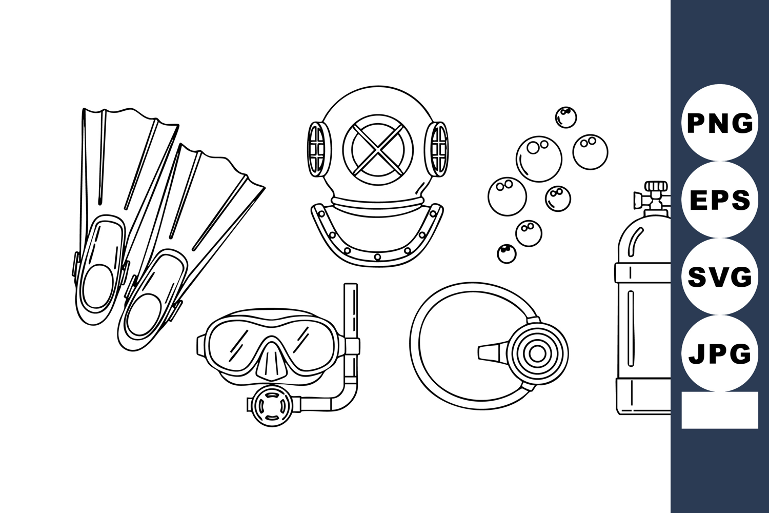 Line Art Illustration Black White Vector Diving Equipment Set Flippers Mask Snorkel Snorkel Helmet Oxygen Oxygen Tank Regulator Diving Gear Safety Underwater Breathing Apparatus Scuba Diving Equipment Marine Sport Gear