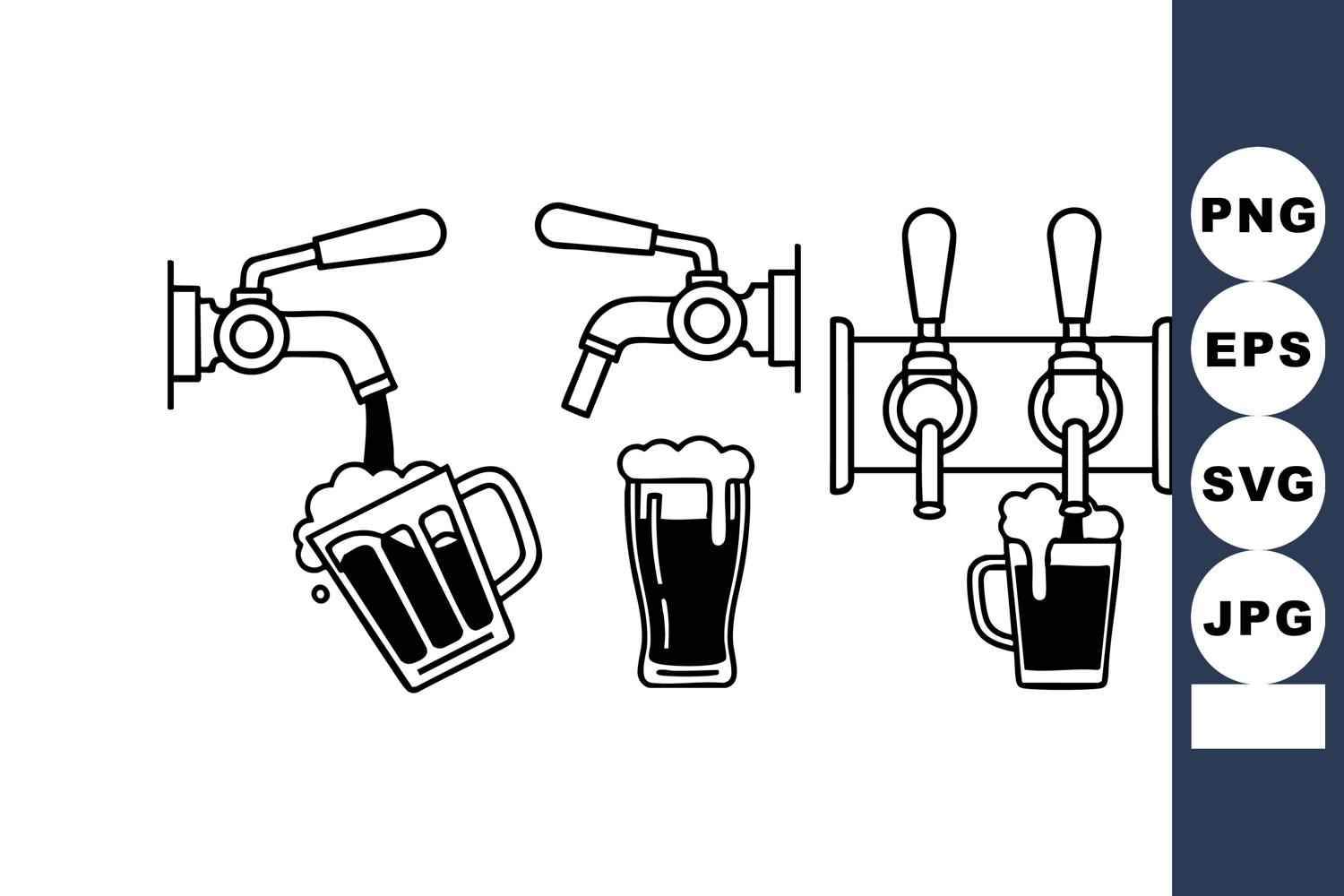 Vector illustration shows beer taps pouring dark beer into glass mugs with foam head in simple black and white style. The image is clean and minimalistic with clear outlines. Cheerful.