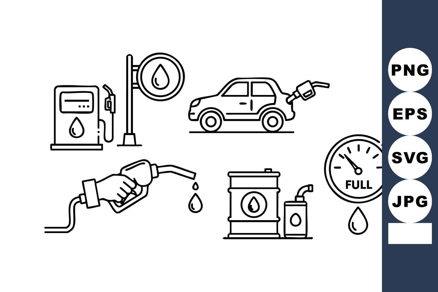 Illustration of fuel gas station pump, car refueling, oil barrel, and full meter showing fuel level and drops in black line style. Simple clear design with utility mood.