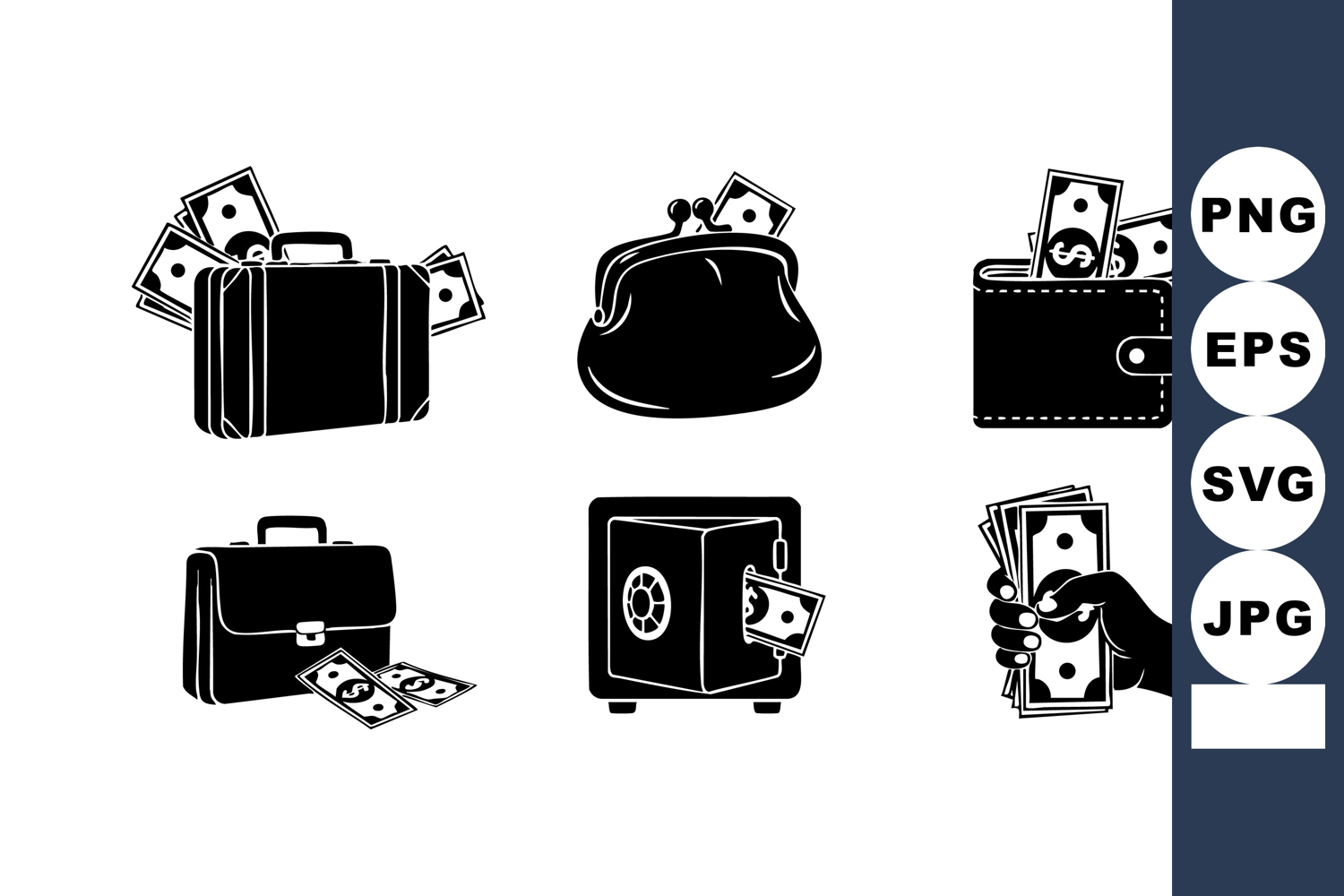 Black White Vector Money Briefcase Purse Briefcase Purse Wallet Purse Wallet Safe Wallet Safe Cash Safe Cash Bills Cash Bills Hand Bills Hand Holding Hand Holding Cash Finance Security Icons