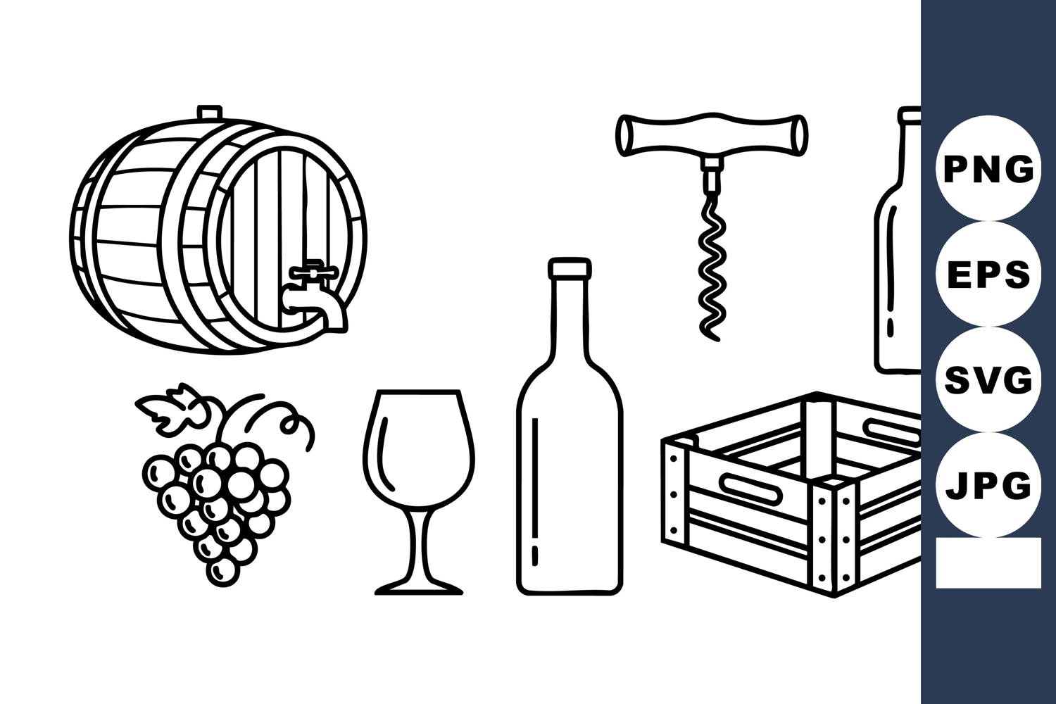 Black White Line Simple Vector Illustration Wine Bottle Glass Wine Barrel Corkscrew Corkscrew Wine Bottle Bottle Glass Grapes Glass Grapes Crate Grapes Wooden Crate Wooden Crate Vector Wine Barrel Illustration