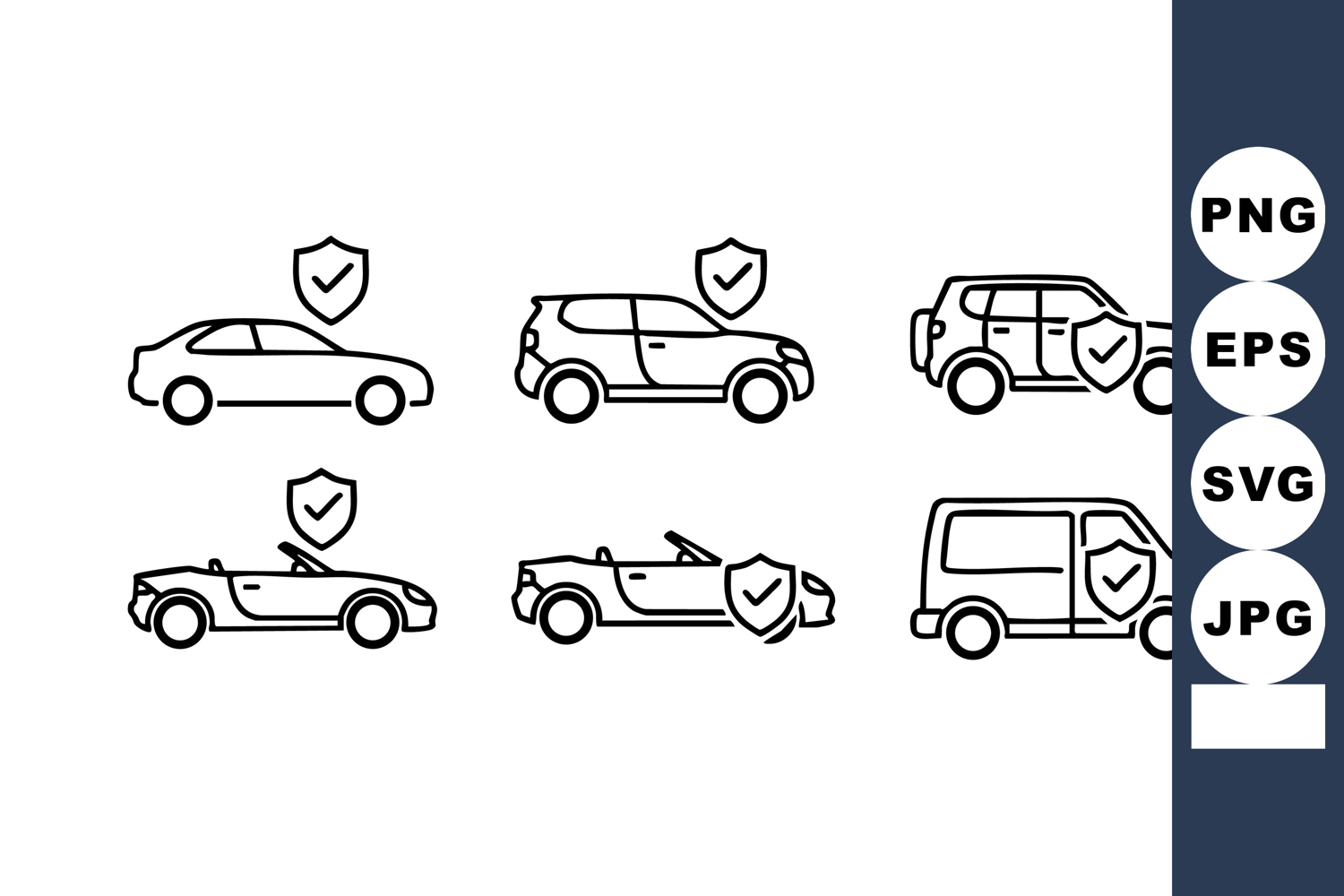 Vector illustration shows six car protection icons with shield symbols representing safety for various vehicle types in a clean black line style calm