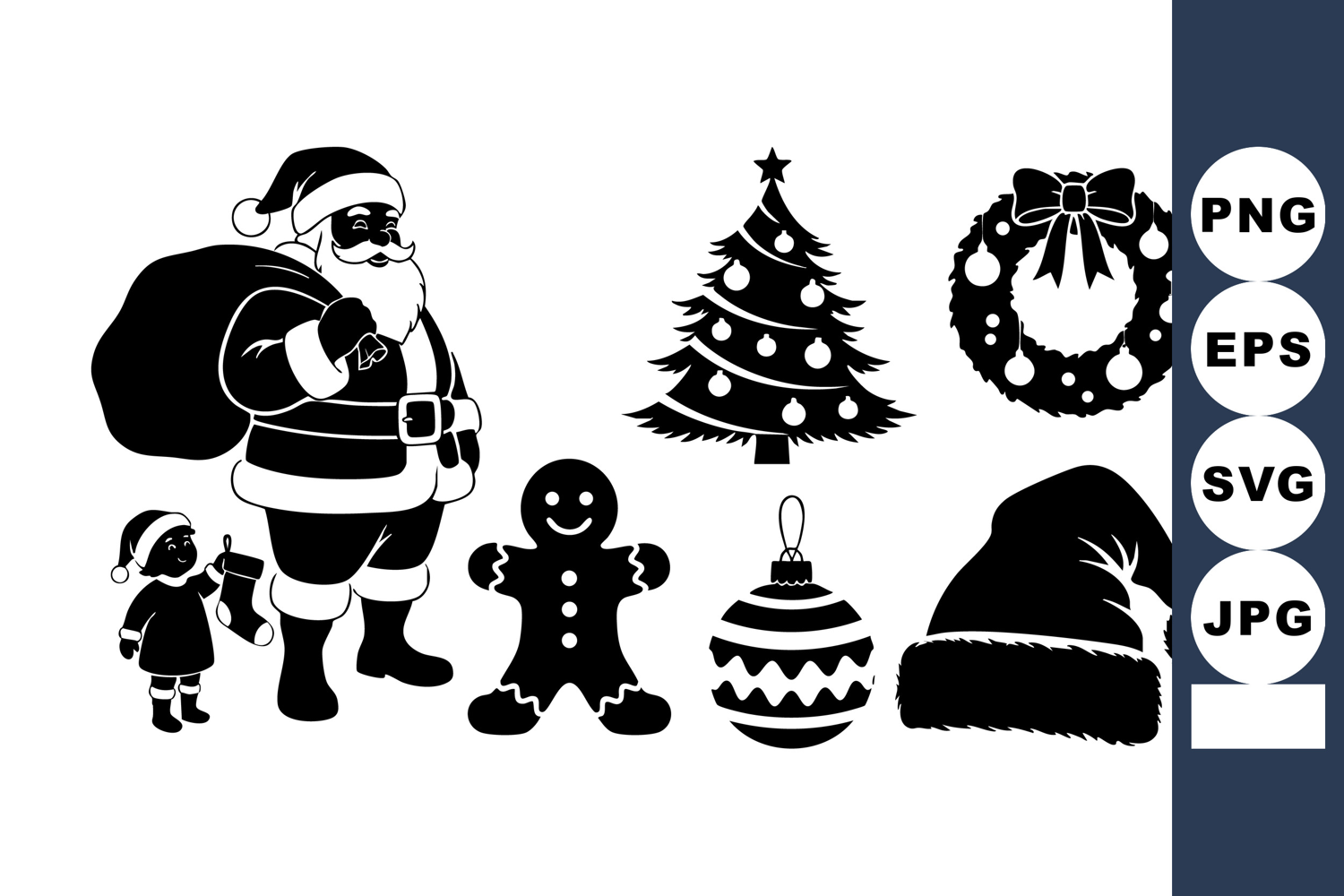 Black silhouettes of Christmas holiday icons including Santa Claus with a girl, gingerbread man, decorated tree, wreath, ornament, and Santa hat in vector style festive joyful