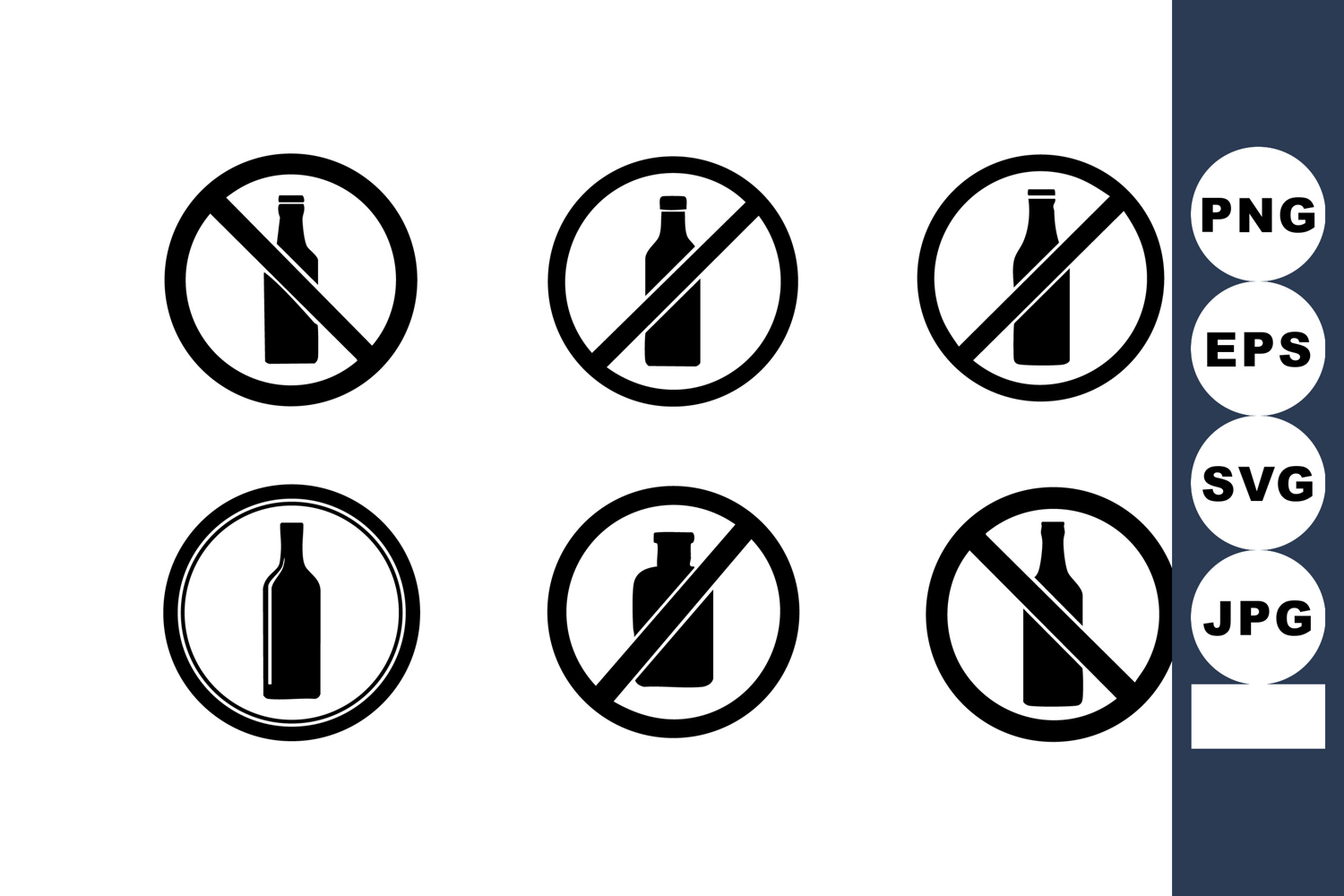 The image shows six vector icons of prohibition signs featuring bottles with circle and cross marks indicating no alcohol . The style is simple and clear. The mood is informative.