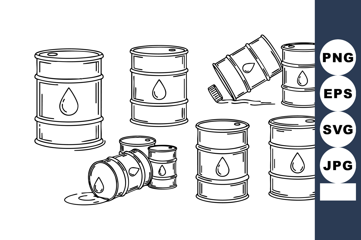 This vector illustration features multiple oil barrels in various positions including standing and spilled. The image is black and white line art with clear details, simple and clean style, minimalistic appearance, industrial theme. Mood is neutral.