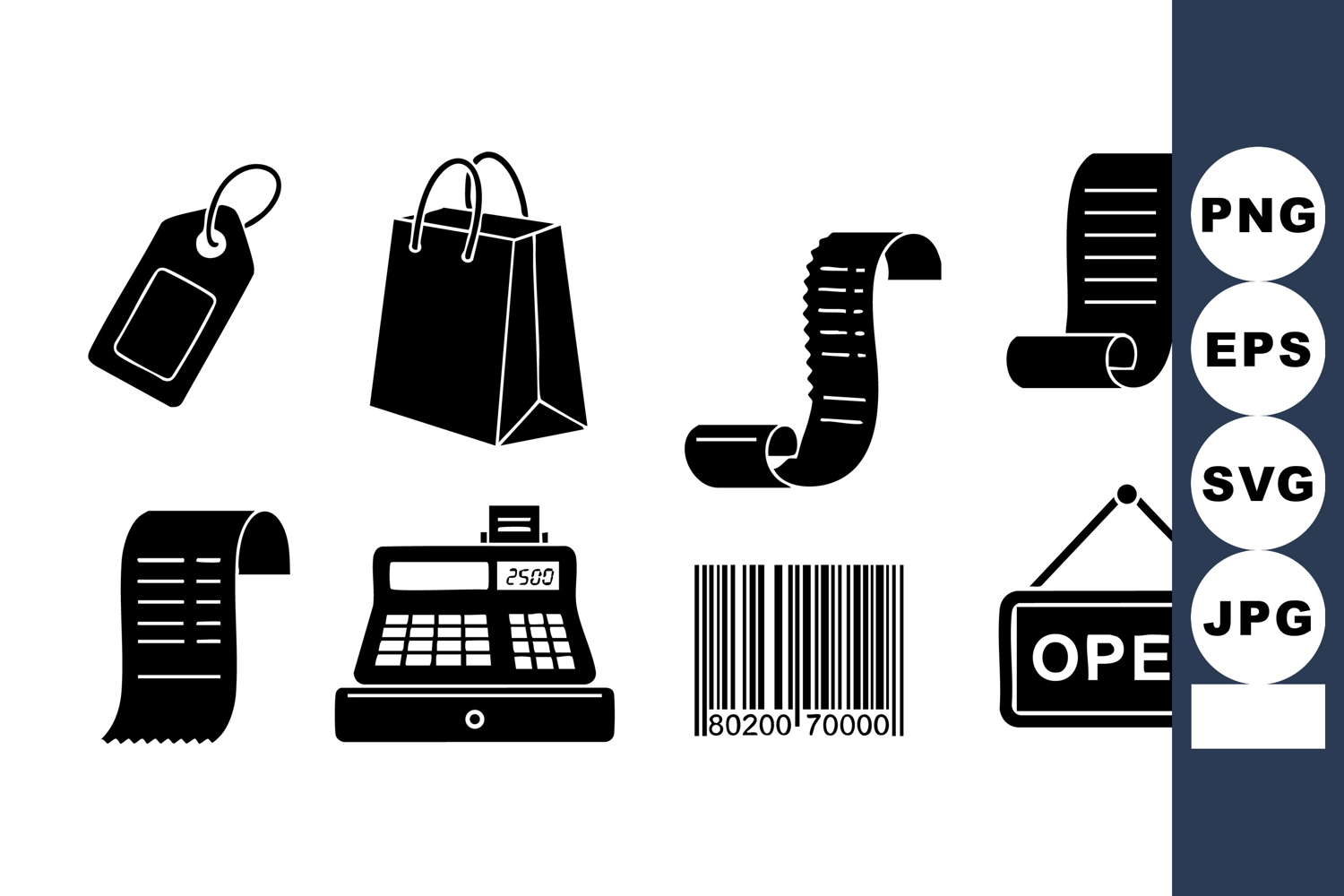 Open Sign Vector Shopping Retail Icons Price Tag Bag Bag Receipt Barcode Receipt Barcode Open Barcode Open Sign Cash Register Store Black White Shopping Shopping Price Tag Price Tag Receipt