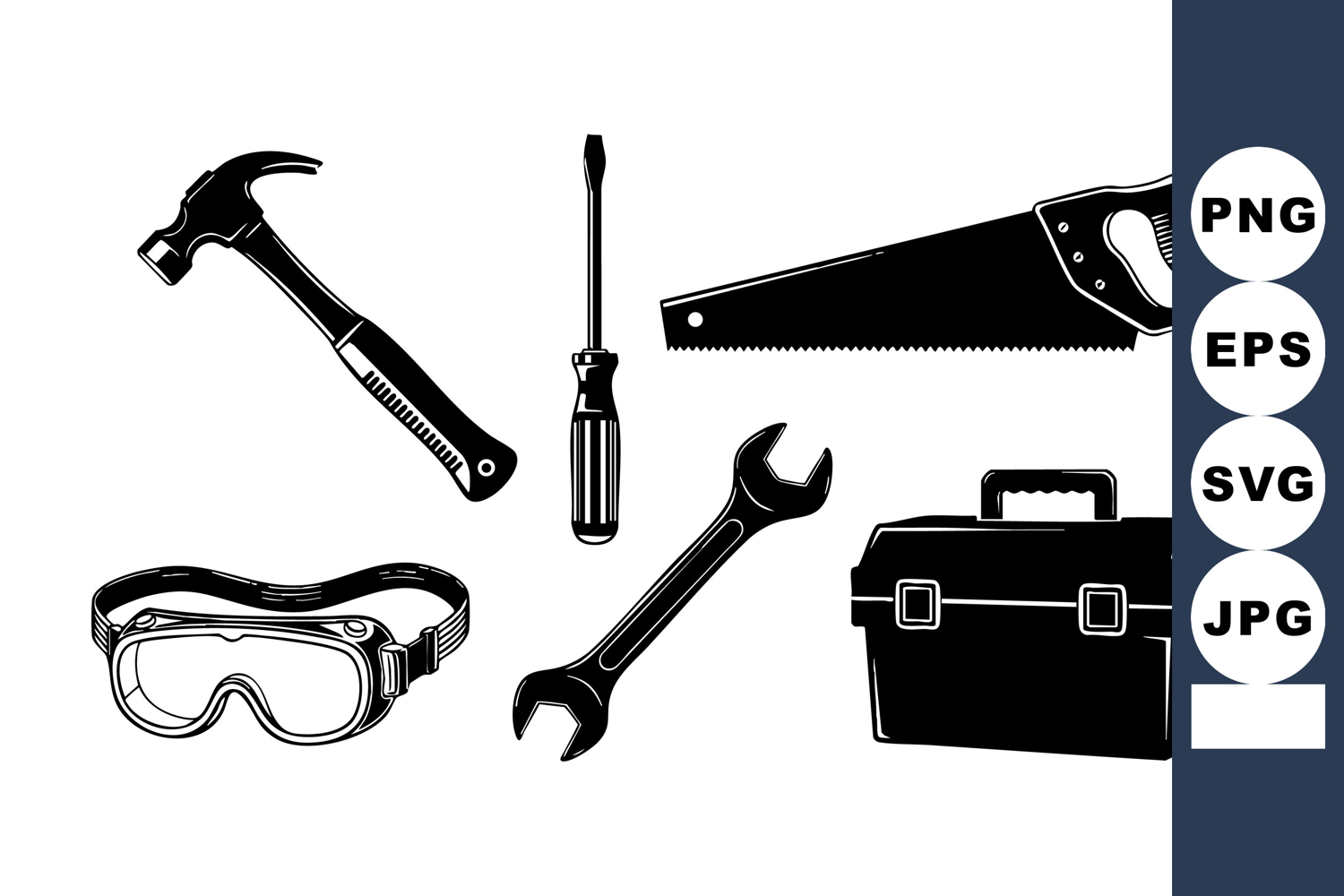 Vector illustration of hand tools including hammer screwdriver saw wrench safety goggles and toolbox displayed in black silhouette style with clear shapes and details creating a practical design suitable for construction or repair themes calm