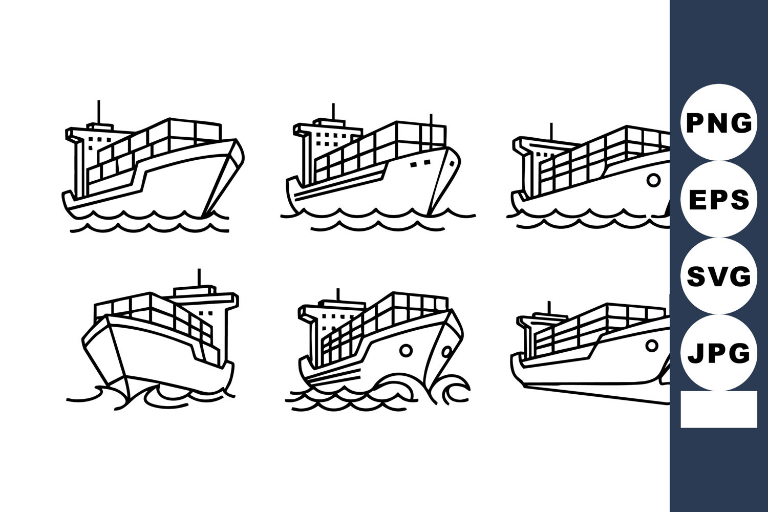 Set of six black outline cargo ship vector icons showing different angles and waves representing sea transport and shipping industry in a simple style. Calm mood.