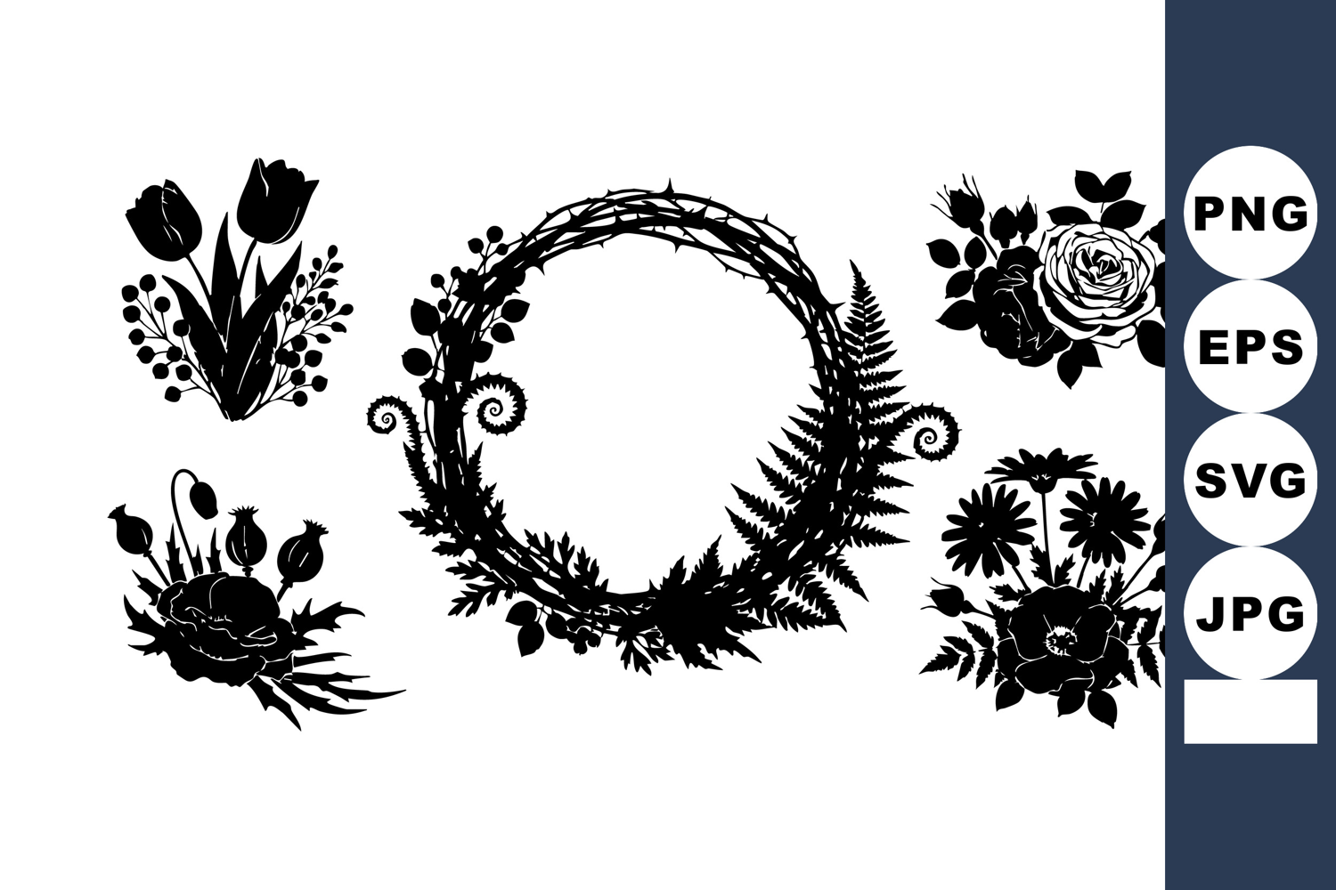 This vector illustration features a black floral wreath and five distinct flower bouquets in silhouette style perfect for decoration and design projects with elegant mood.