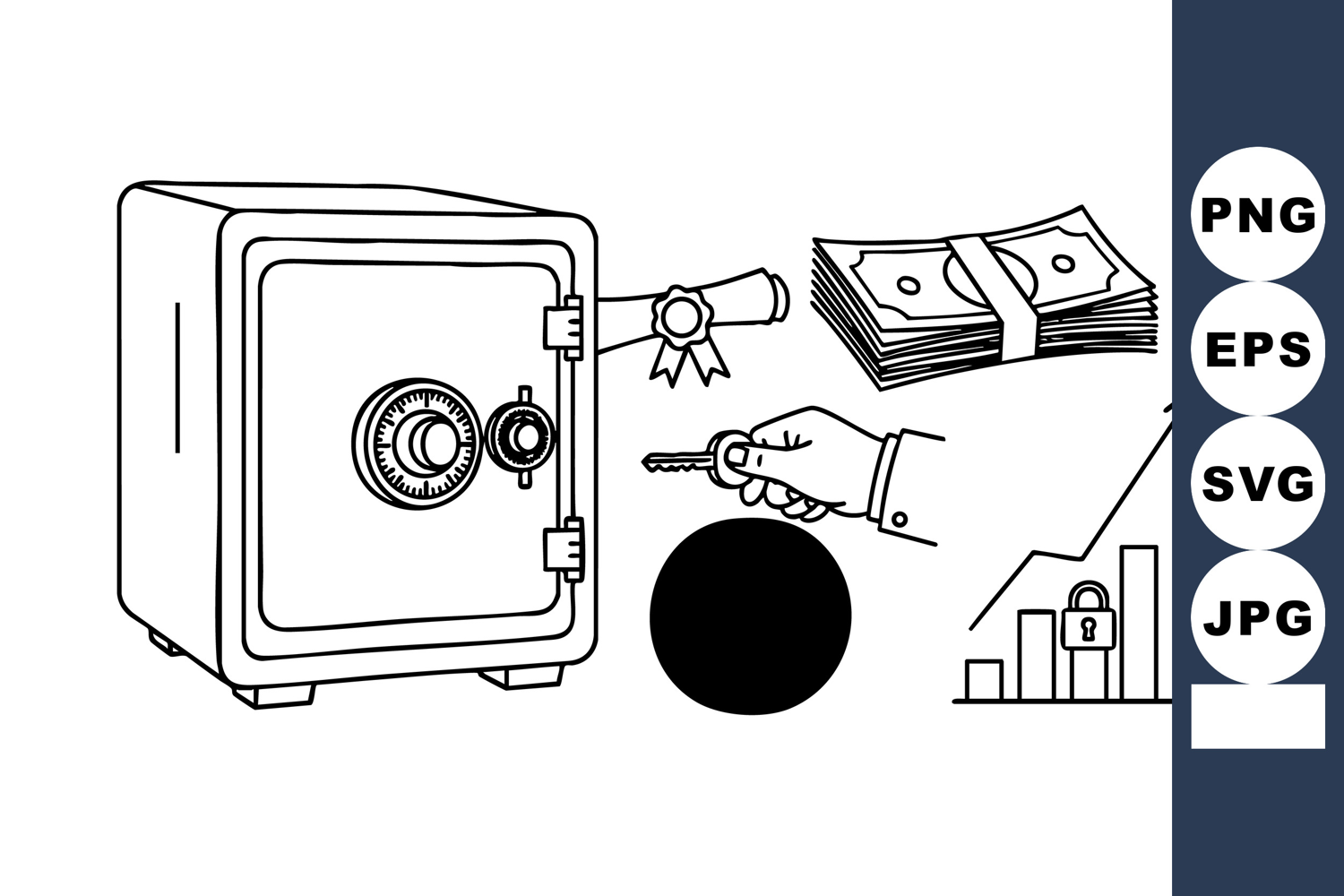 Illustration shows a safe deposit box with an open door a hand holding a key a certificate a stack of money and a security graph indicating growth in protection clear and simple design calm