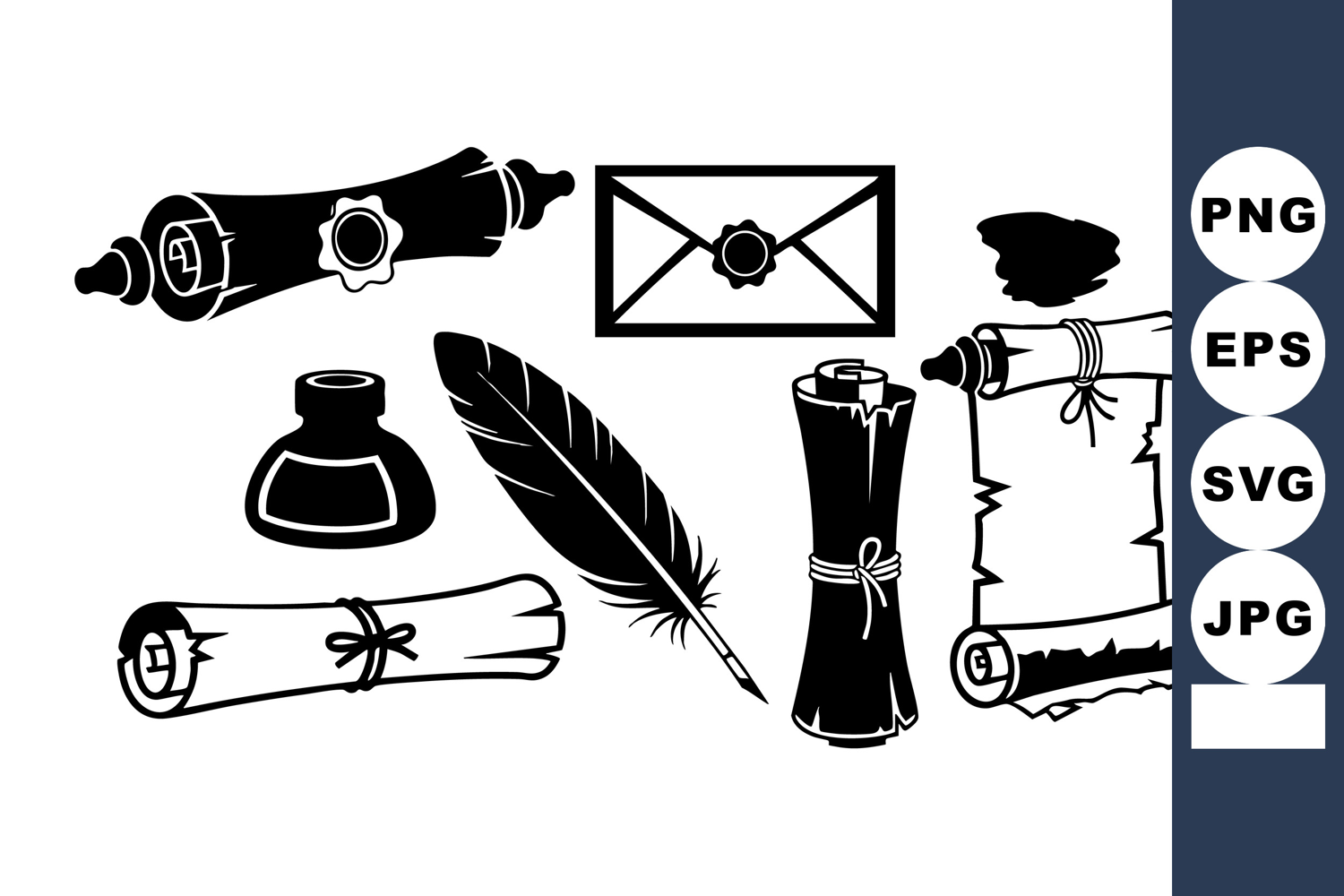 Black Silhouette Style Classic Writing Tools Vintage Ink Feather Feather Quill Scroll Quill Ink Bottle Scroll Letter Envelope Letter Envelope Seal Old Parchment Paper Calligraphy Pen Quill Antique Document Message