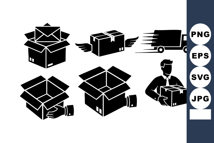 Black silhouette icons show various delivery and shipping scenarios including open boxes and courier holding parcels in motion style. Symbols represent fast transport service with dynamic mood.