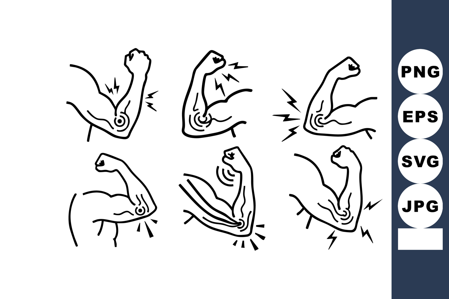 Vector illustration shows different arm positions with highlighted pain points around elbow and muscles indicating injury or inflammation in black line style. Informative and clear.