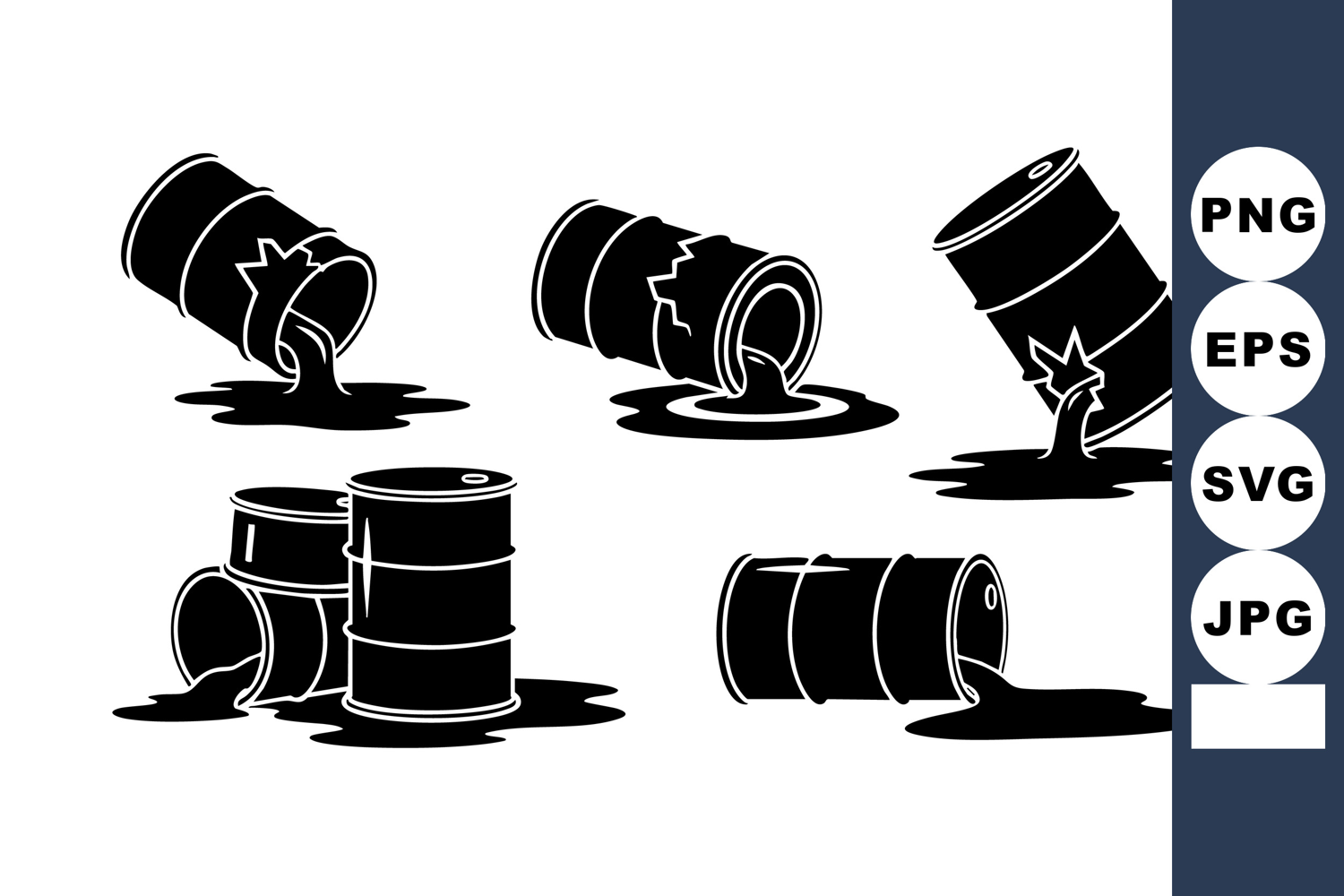 Oil Barrels Leaking Black Liquid Spill Vector Illustration