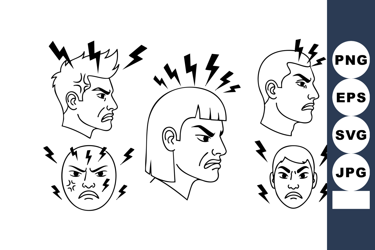 Five angry men heads show electric shock pain and stress with lightning bolts around them in black line style vector illustration intense mood