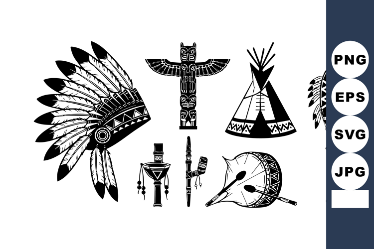 This vector set features Native American traditional symbols including a headdress, totem, tipi, drum, peace pipe, and figures in black silhouette style. The design is cultural and historic.