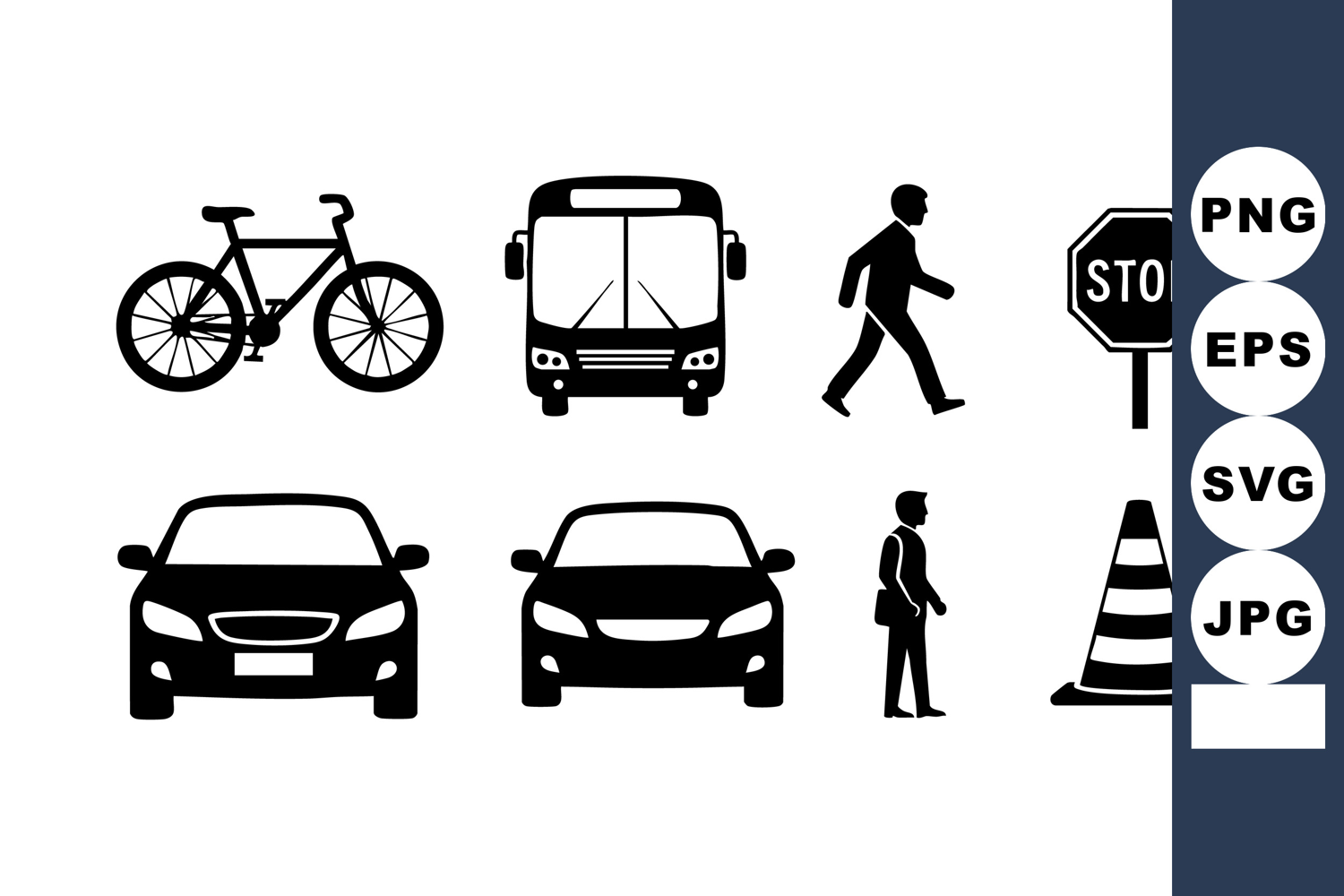 Black silhouette icons of transportation including bicycle, bus, pedestrian, stop sign, cars, and traffic cone shown in simple vector style. Clear and minimal design. Functional and clean mood.