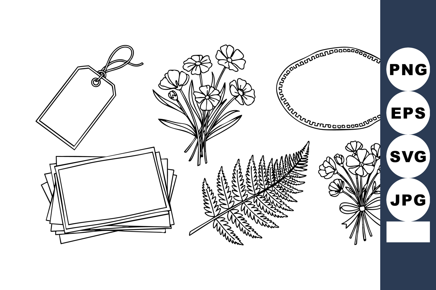 This vector features detailed vintage line art of flowers, a fern leaf, blank tags, and decorative frames suitable for design projects with a classic natural style calm