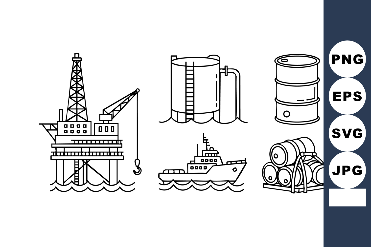 Black and white vector illustration showing an offshore oil rig platform, storage tank, tanker ship, and oil barrels grouped. Industrial energy concept with clean line art style. Professional mood.