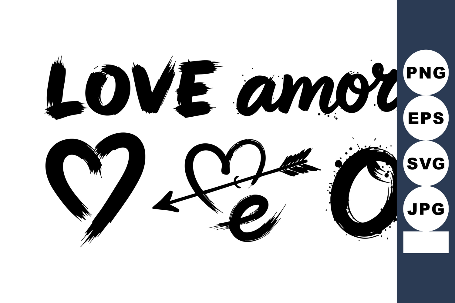Black brush stroke calligraphy vector design featuring love and amor words with heart shapes and arrow elements expressing romance and passion artistic style mood.