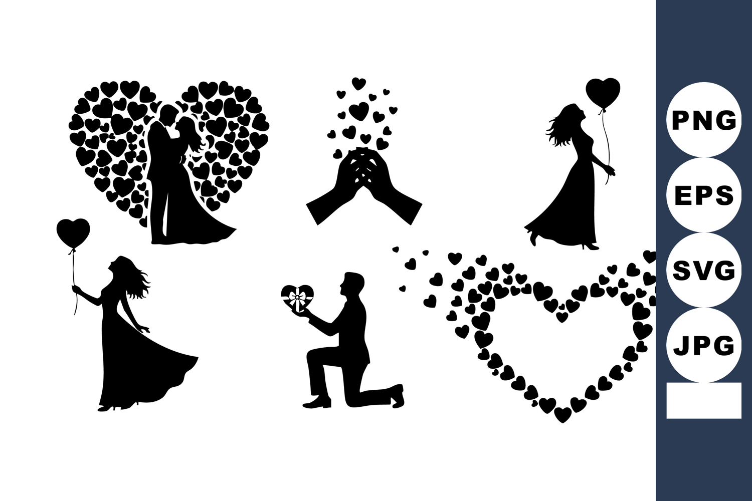 Black Silhouette Style Romantic Couple Silhouettes Heart Shapes Love Love Symbols Proposal Couple Proposal Scene Romantic Wedding Bride Groom Holding Gift Passion Relationship Feelings Emotion Affection Romance Tender Love Moment