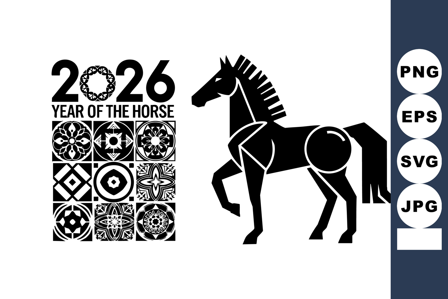 This vector illustration features a black horse silhouette alongside decorative geometric patterns and 2026 year of the horse text in a clean black and white style creating a modern festive mood.
