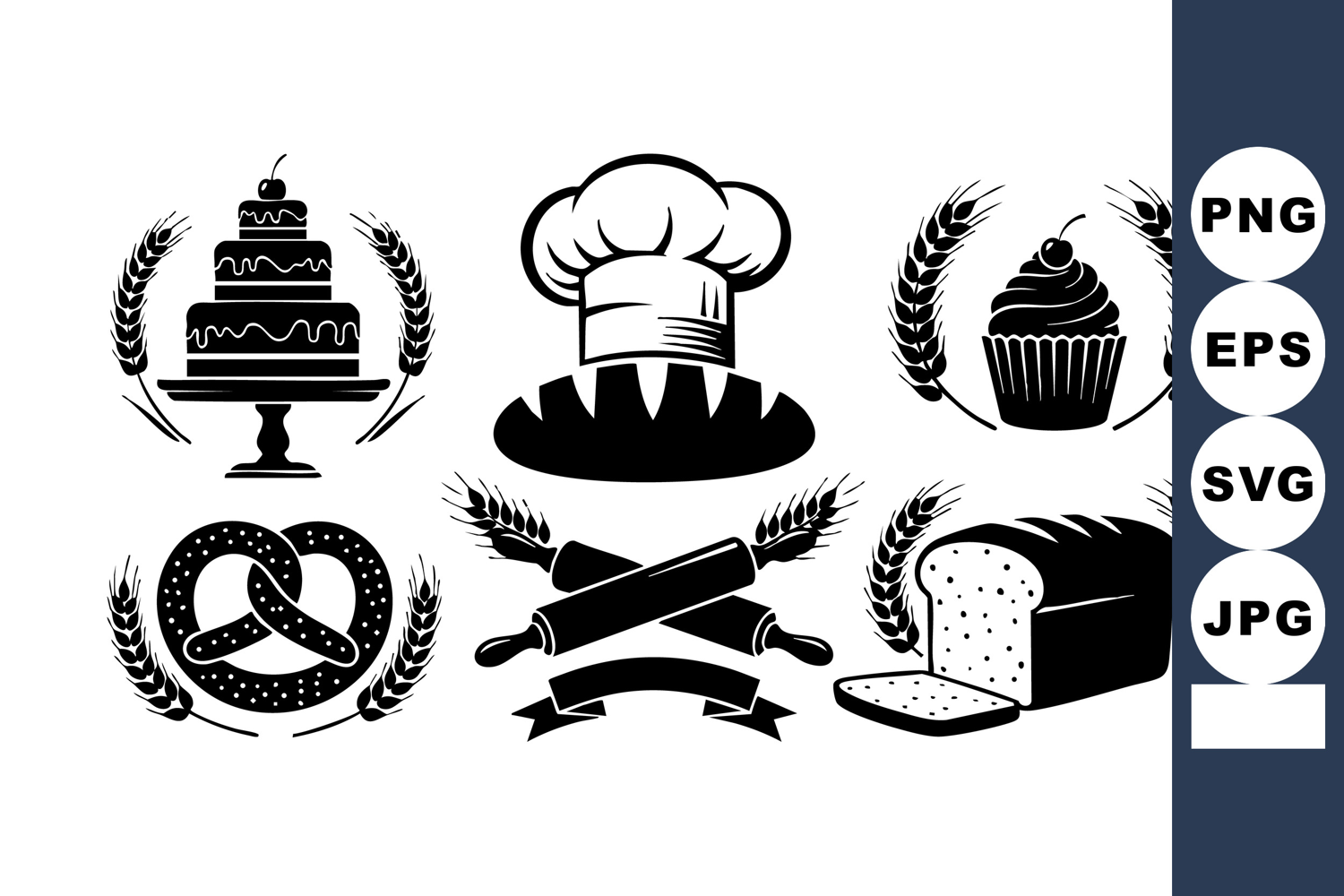 Bakery Logo Design Clean Vector Style Dessert Sweet Pastry Classic Elegant Mood Cake Cupcake Bread Pretzel Chef Hat Rolling Pins Vector Black White Bakery Wheat Decoration Vector Baking Flour Kitchen