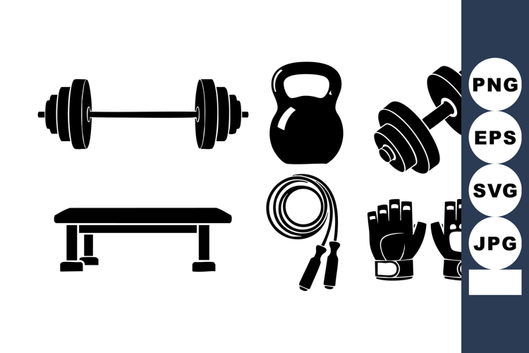 Black Silhouette Gym Fitness Workout Strength Gym Equipment Barbell Barbell Kettlebell Dumbbell Kettlebell Dumbbell Bench Dumbbell Bench Jump Bench Jump Rope Jump Rope Gloves Strength Training Exercise Gloves Vector Illustration