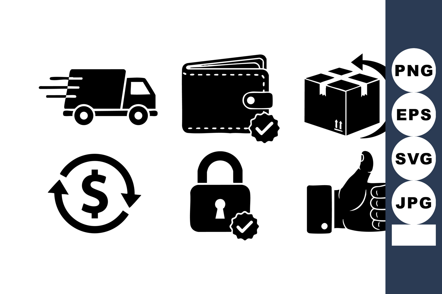 This vector set shows delivery truck, wallet, secure lock, dollar cycle, boxed parcel, and thumbs up icons representing payment security and fast shipping in a clean black style. Modern.
