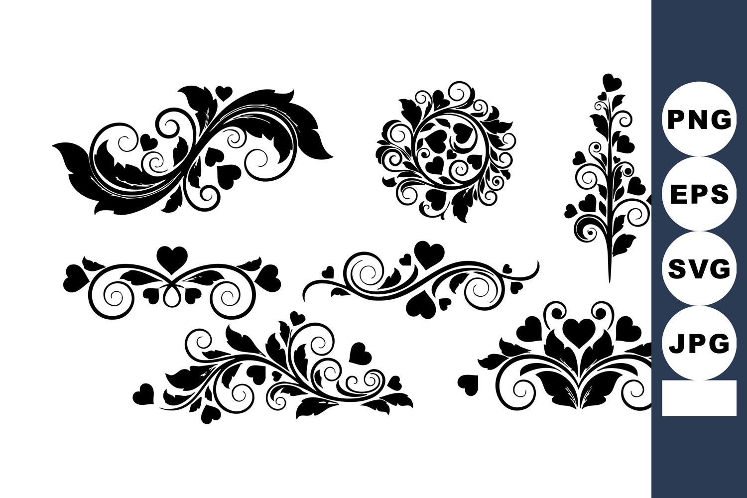 This vector file displays black floral decorative swirl elements with heart shapes and leaves arranged in elegant ornamental designs suitable for various artistic projects calm and classic