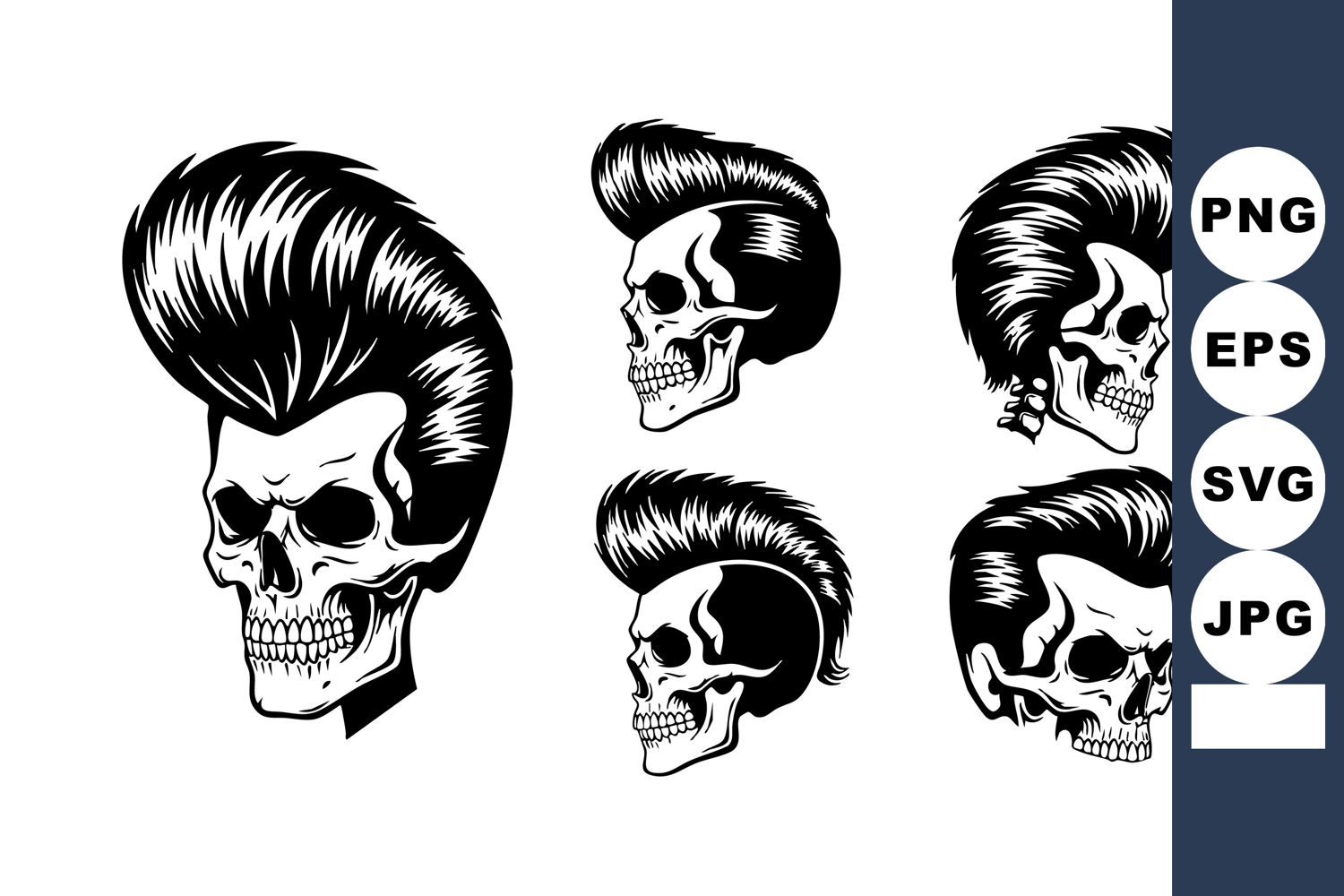 Black And White Skull Vector Set Skull With Pompadour Pompadour Hairstyle Vector Rockabilly Vintage Style Retro Skull Illustrations Vintage Skull Design Pompadour Hair Styles Rockabilly Hair Designs Vintage Hair Illustrations