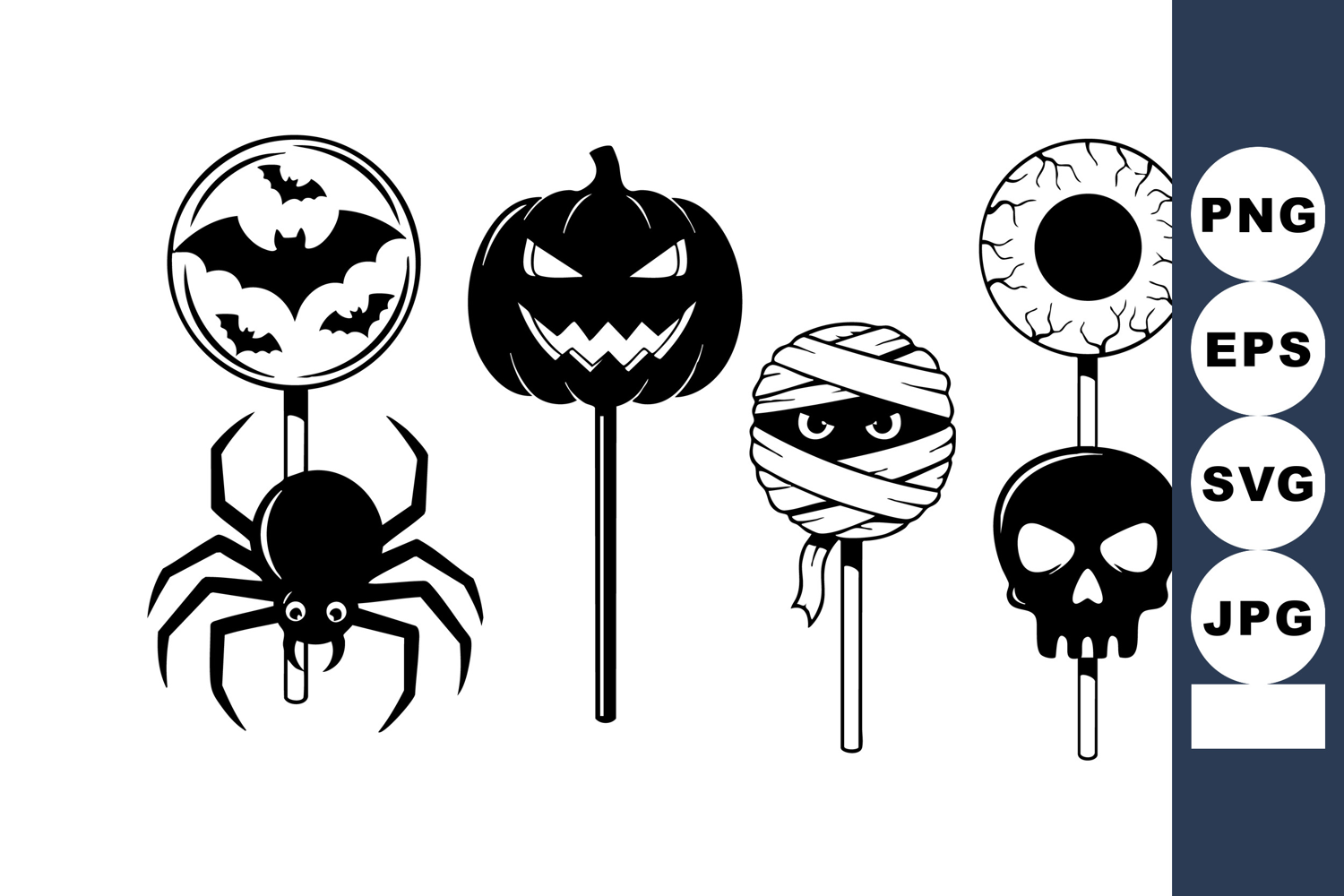Black White Vector Halloween Candy Lollipops Spooky Halloween Candy Candy Lollipops Spider Lollipops Spider Pumpkin Spider Pumpkin Mummy Pumpkin Mummy Skull Vector Illustration Spooky Scary Halloween Treat Festive Halloween Candy