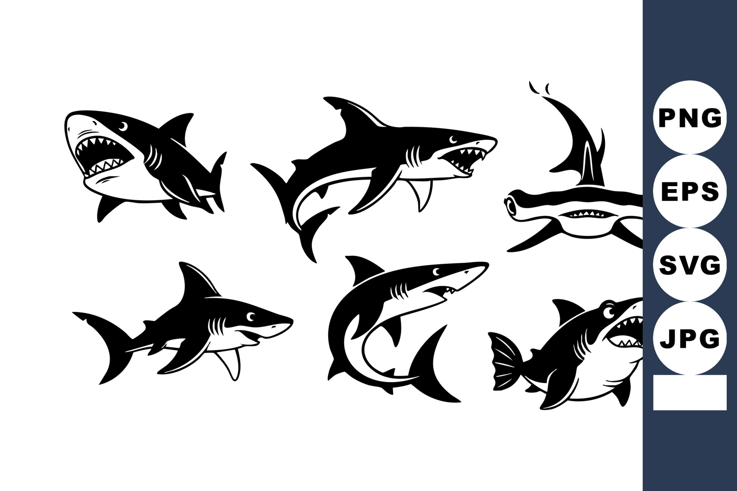 This vector features six black shark silhouettes in different poses showcasing ocean wildlife and sea creatures in a simple bold style perfect for marine themed projects calm