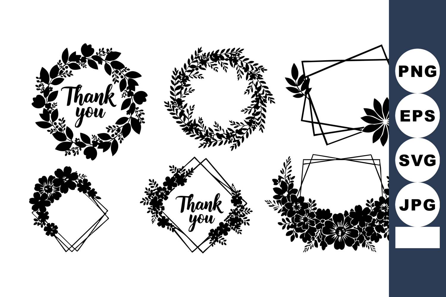 This vector set displays six black floral wreaths and frames with thank you text and decorative flowers perfect for elegant cards and invitations in a classic style calm