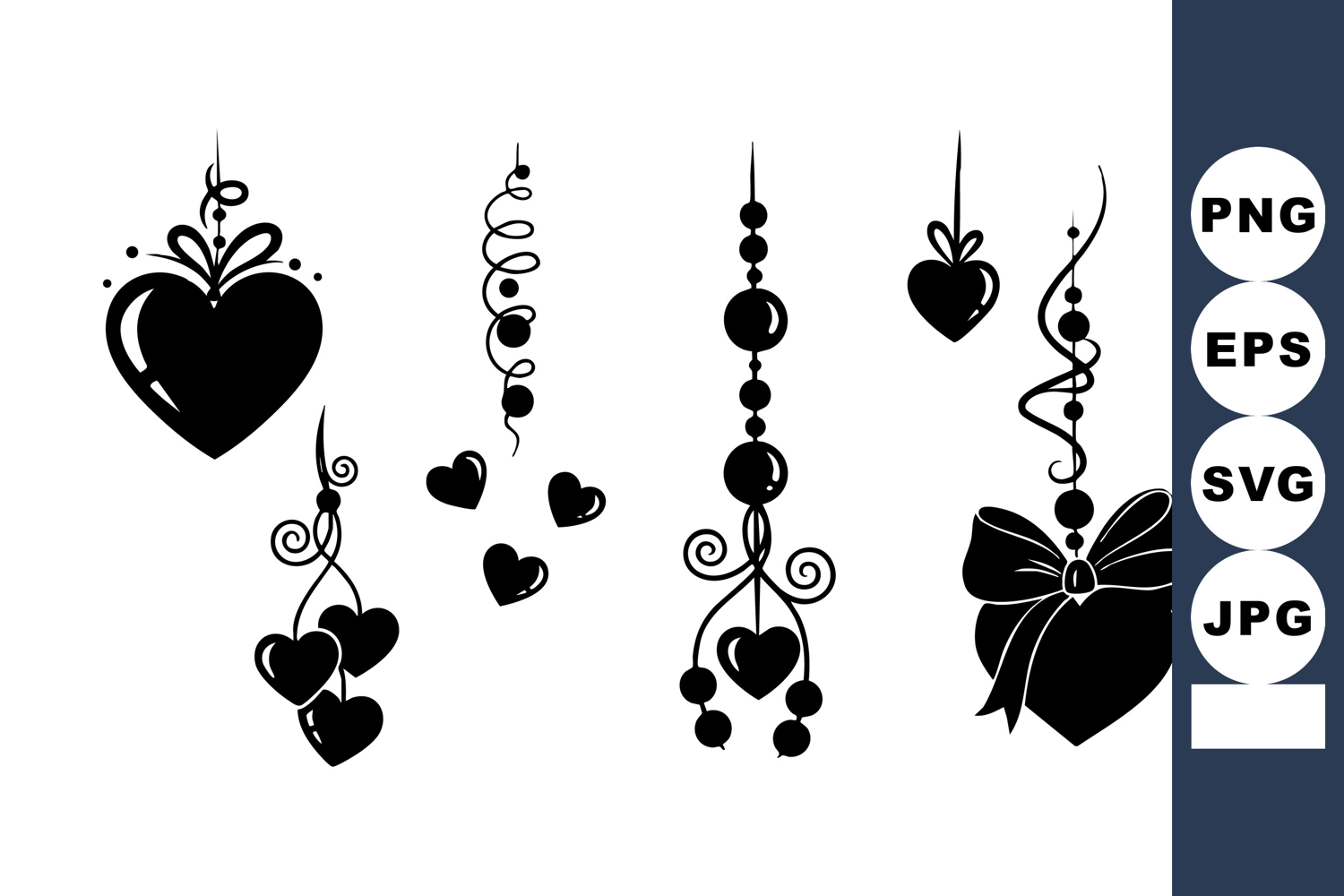 This vector illustration features various decorative hanging hearts with ribbons and a bow in black silhouette style. Perfect for romantic design projects with a charming mood.