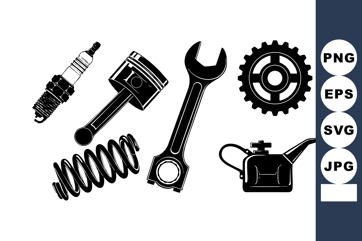 This vector illustration shows black automotive repair tools including a spark plug piston wrench gear oil can and spring arranged on a white background detailed and clear design technical and practical mood