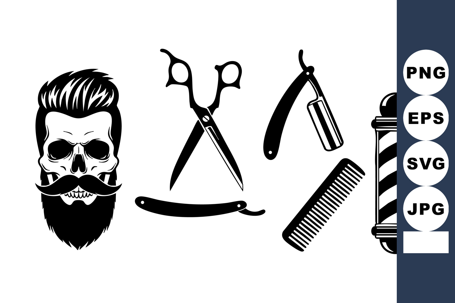 Skull Mustache Barber Scissors Razor Comb Pole Vector example image 1