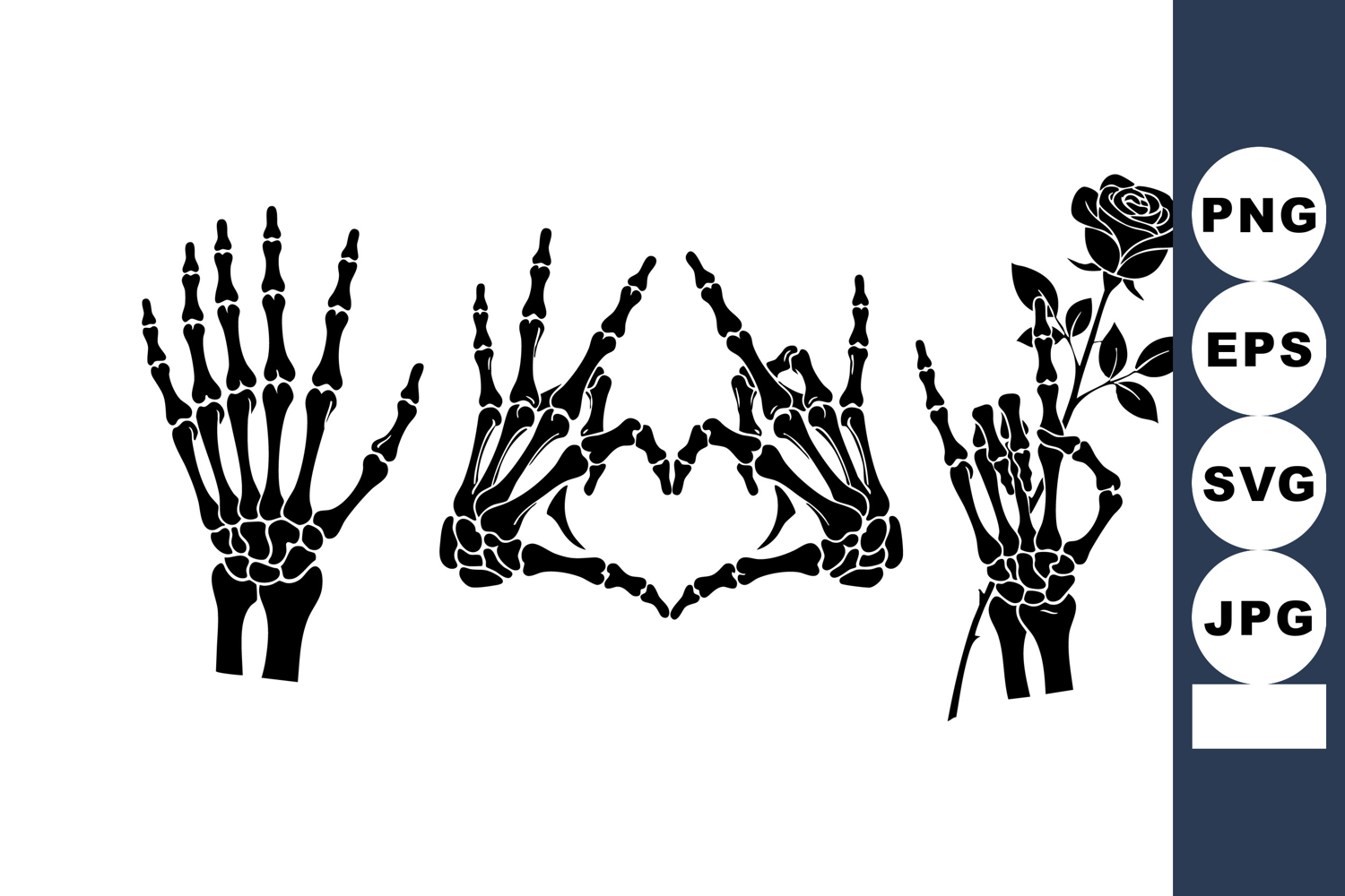 This vector illustration shows three skeleton hands in black. One hand forms a heart shape, and another holds a rose. The design is minimalistic and striking, artistic mood.