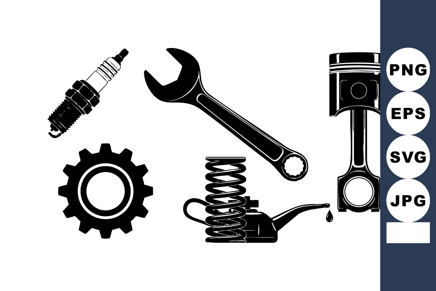 Spark Plug Piston Automotive Engine Parts Engine Parts Wrench Wrench Spark Plug Piston Gear Spring Gear Spring Oil Spring Oil Drop Oil Drop Silhouette Black Mechanic Repair Repair Maintenance Tool