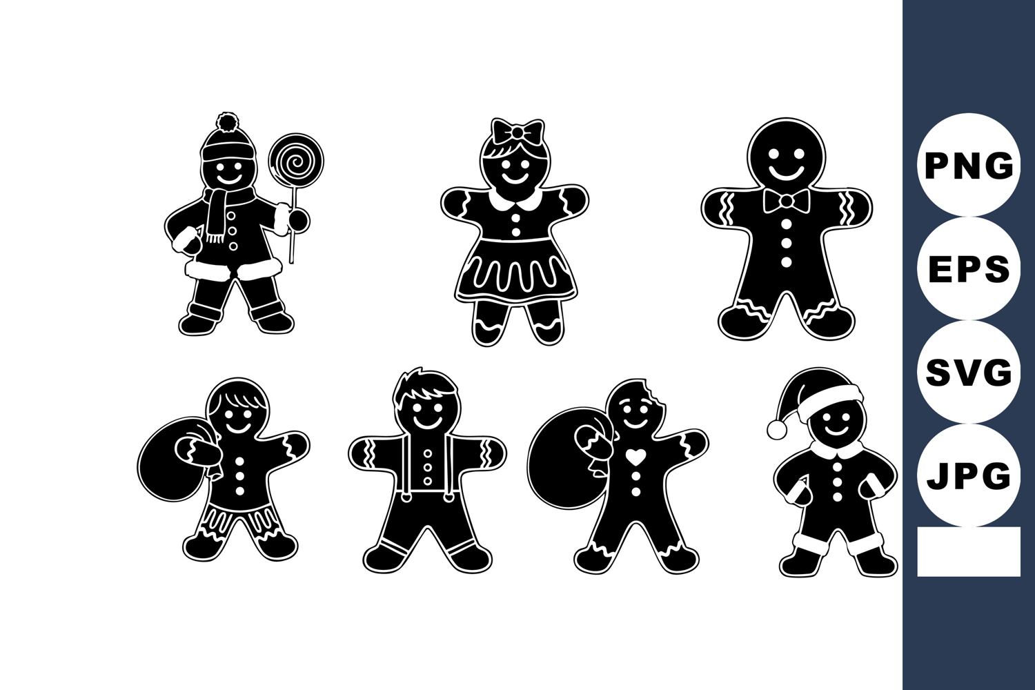 This vector shows seven gingerbread people cookies with holiday themes including smiling faces and festive accessories in black and white style cheerful mood