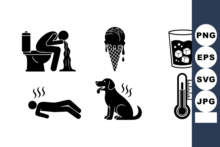 This vector illustration shows common sickness symptoms including vomiting, nausea, fever, and temperature with icons of a sick person, ice cream, a dog, and thermometer in black style. calm