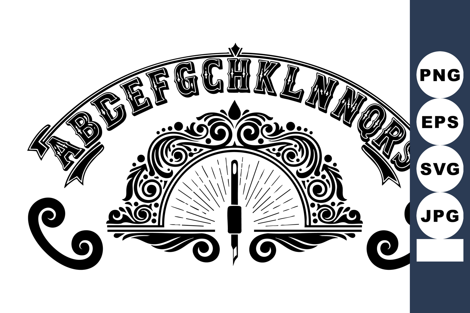 This vector illustration features a vintage decorative alphabet set from A to S with ornate floral elements and a central pen nib symbol in black and white style creating an elegant look.