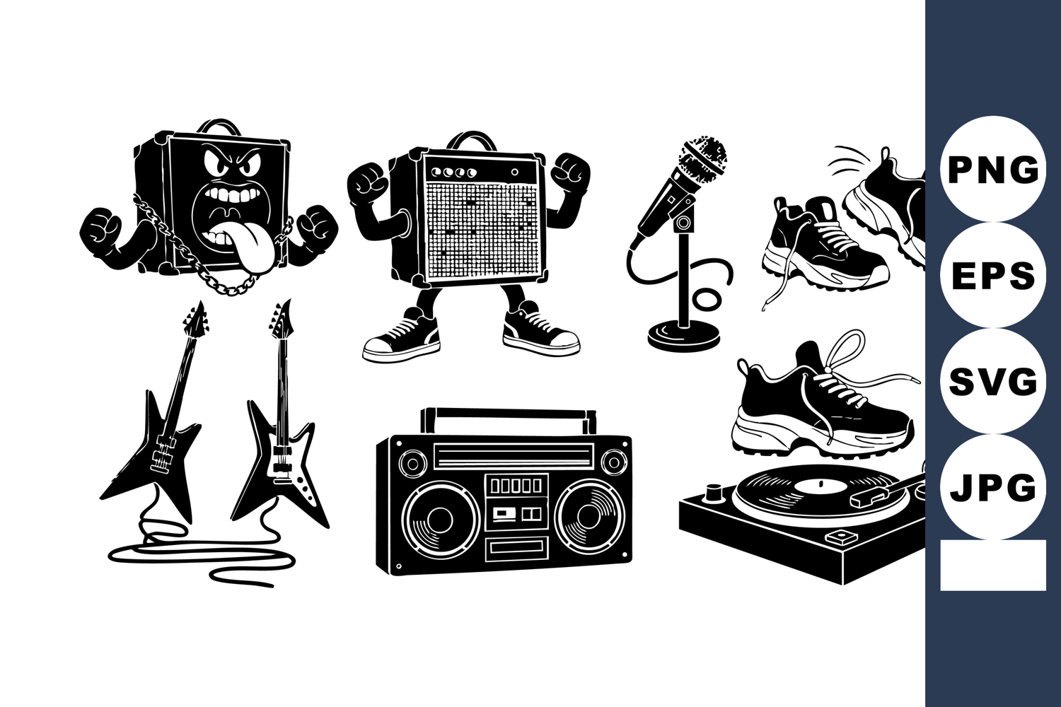 Vinyl Record Player Electric Guitar Vector Retro Music Icons Black White Cartoon Vintage Boombox Microphone Hip Hop Sneakers Classic Hip Hop Urban Culture Vibe Music Beat Rhythm Dance Party Energy