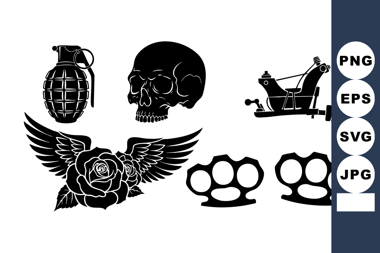 Black Silhouette Art Skull Grenade Wings Wings Rose Tattoo Tattoo Machine Design Brass Knuckles Vector Dark Mood Design Bold Style Tattoo Skull Wings Rose Vector Skull Grenade Dark Tattoo Element