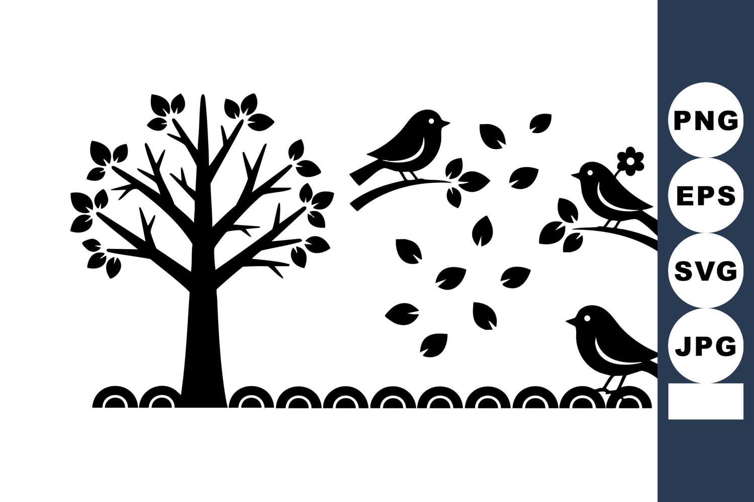 Black silhouette vector illustration shows a tree with birds flying and sitting with leaves falling around. The design is simple and natural with a peaceful mood.